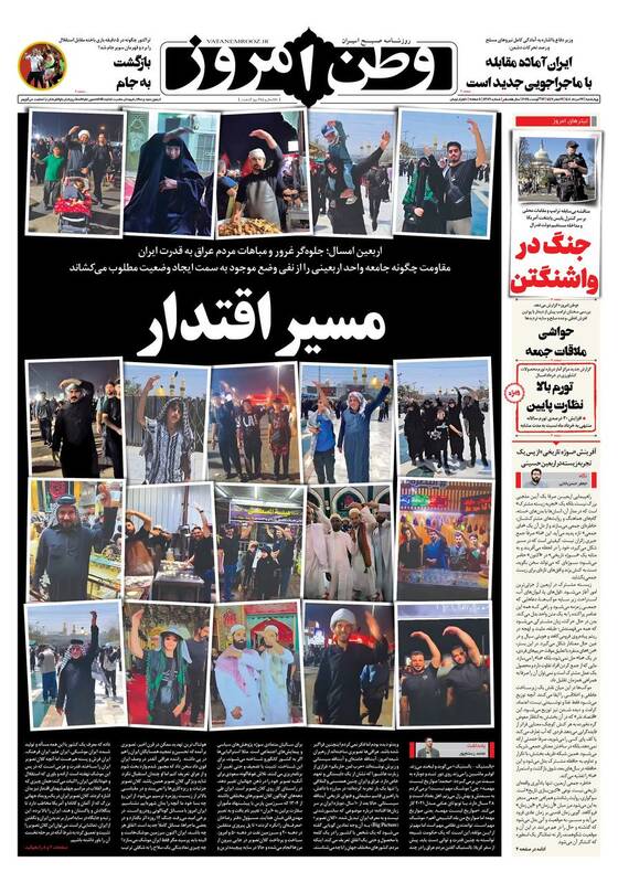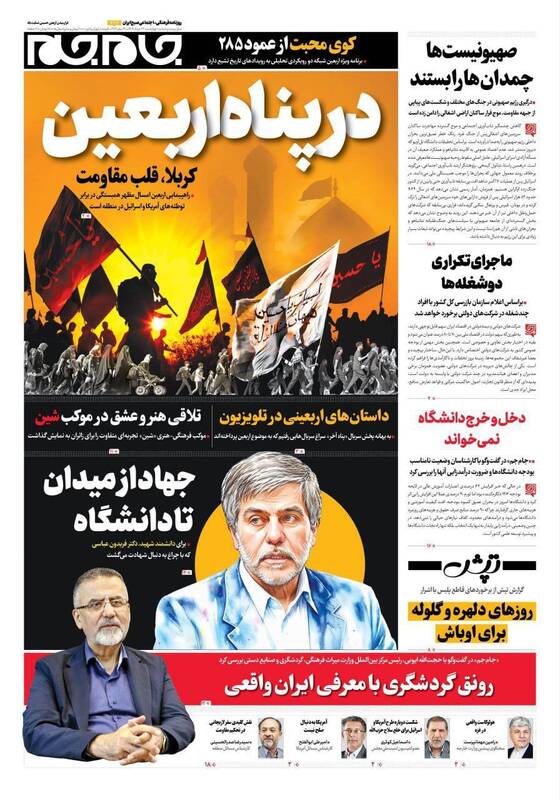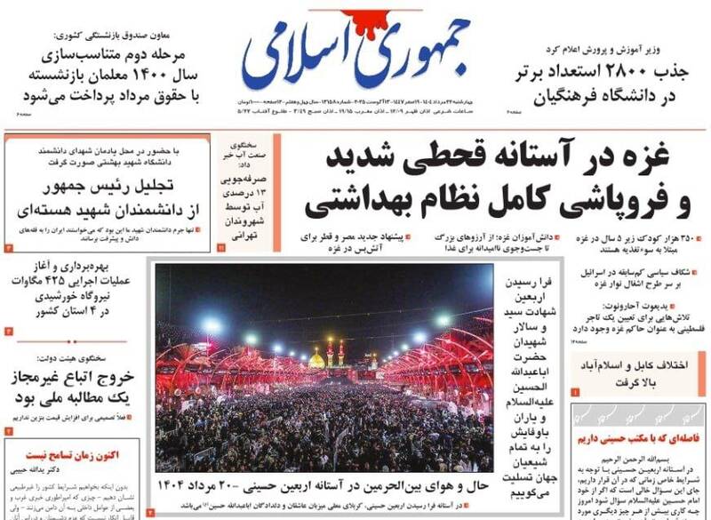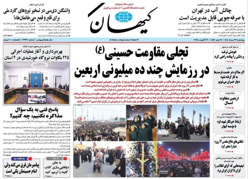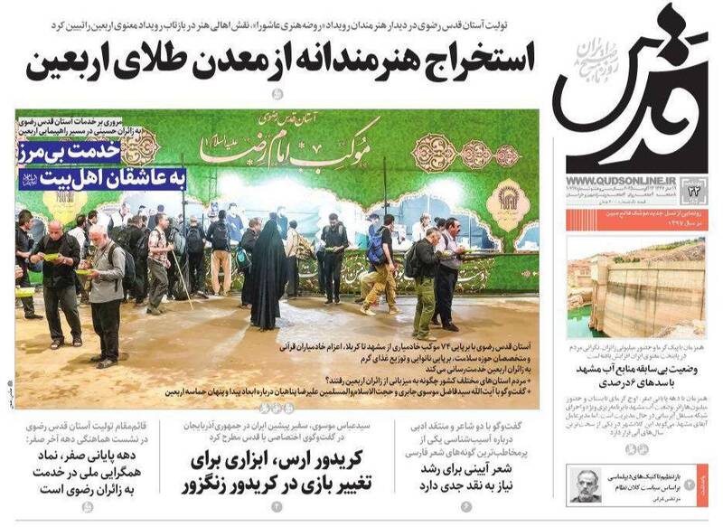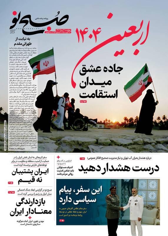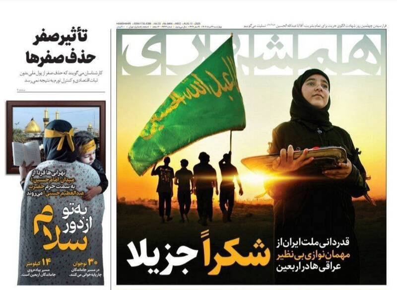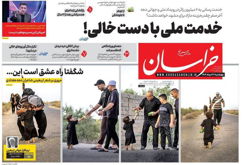تجلی مقاومت حسینی در رزمایش چند ده میلیونی اربعین، مسیر مقاومت، در پناه اربعین، شکرا جزیلا، خدمت ملی با دست خالی و…از جمله تیترهای روزنامههای چهارشنبه ۲۲ مرداد هستند.