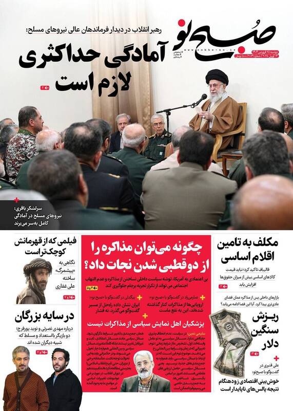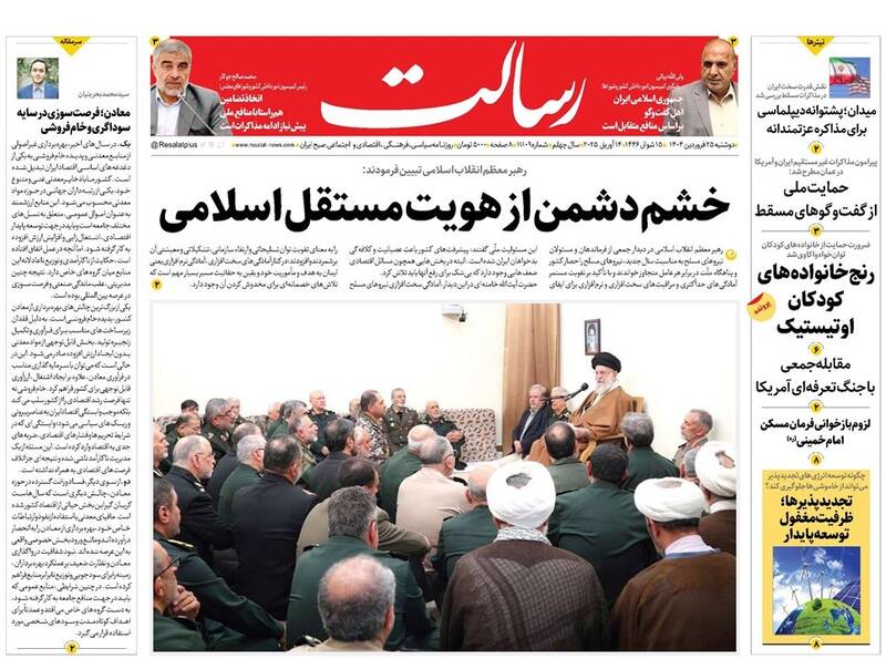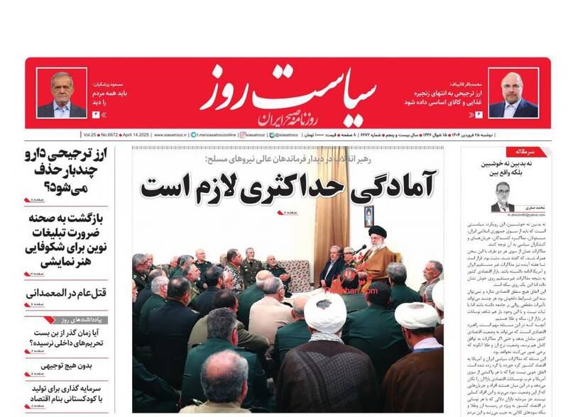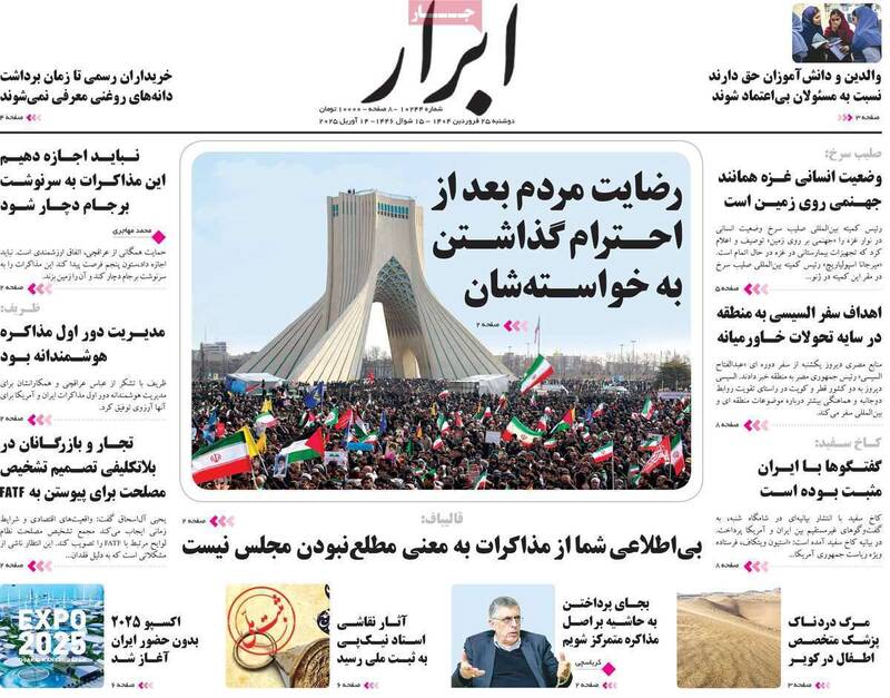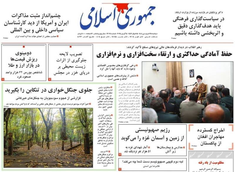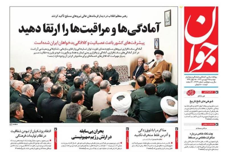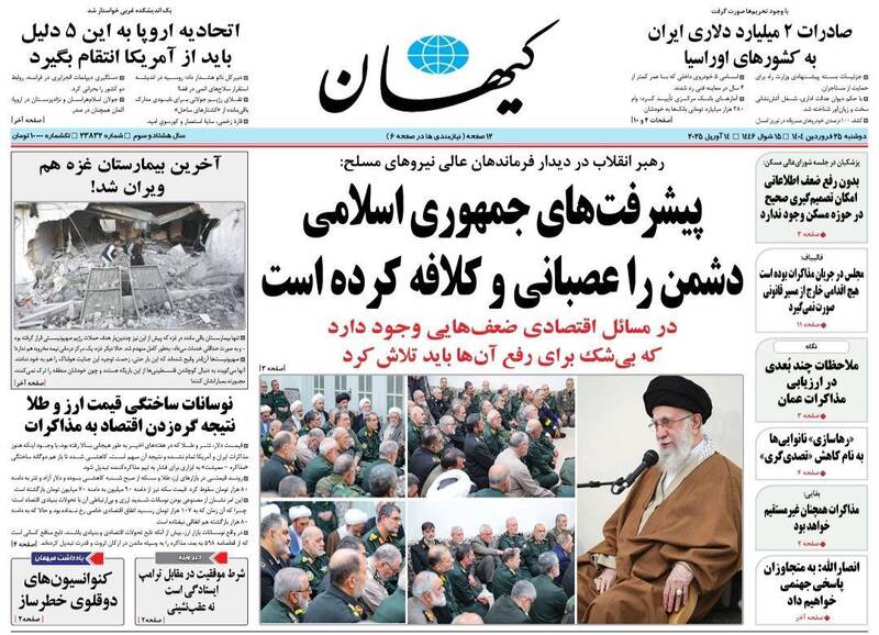 پیشرفتهای جمهوری اسلامی دشمن را کلافه و عصبانی کرده است، آمادگیها و مراقبتها را ارتقا دهید،خوش خیالی ممنوع، روایت موافقان مذاکره، حباب و… از جمله تیترهای روزنامههای دوشنبه ۲۵ فروردین ۱۴۰۴ هستند.