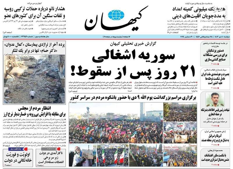 سوریه اشغالی ۲۱ روز پس از سقوط!، جای خالی تولید برندهای جهانی، بصیرت ملت و تنگنظری برخیها، تب و لرز ارز، تیتر برخی از روزنامههای دوشنبه ۱۰ دی ۱۴۰۳ است.