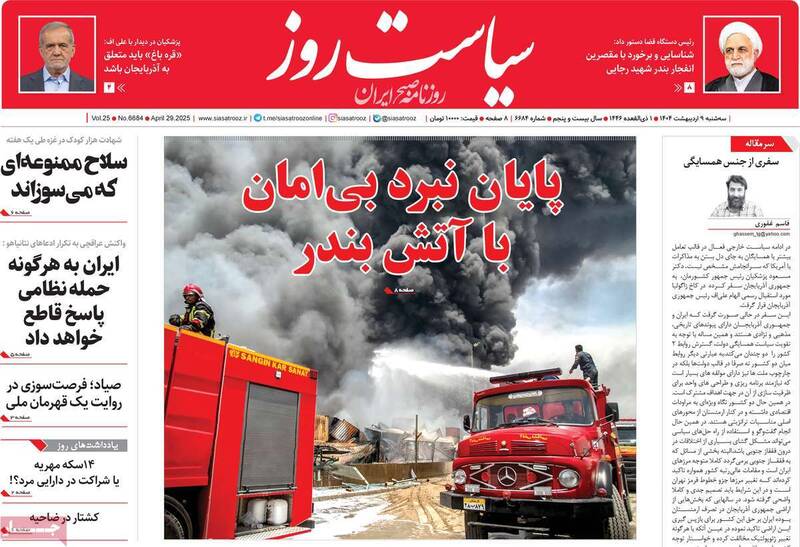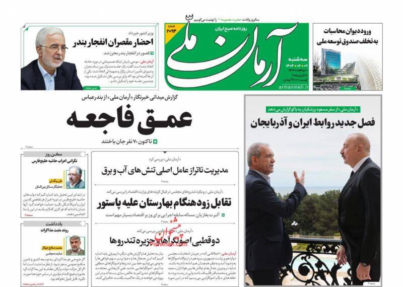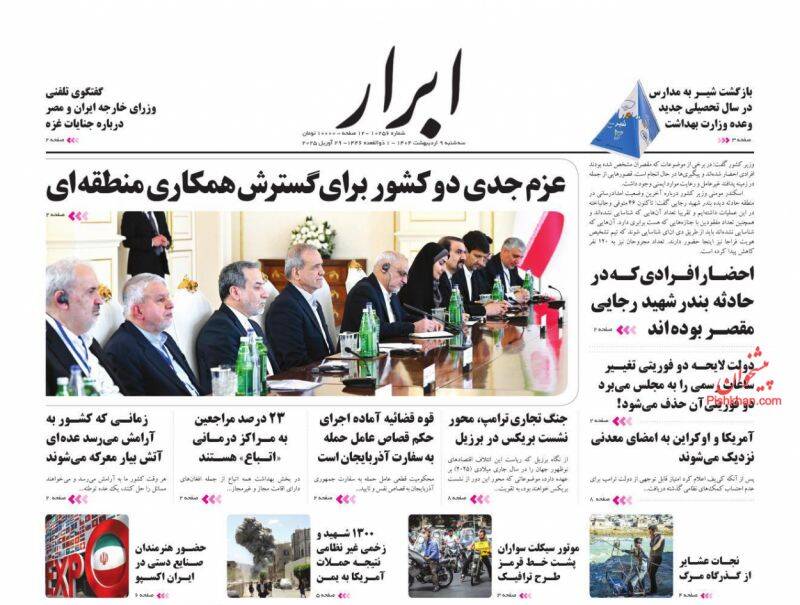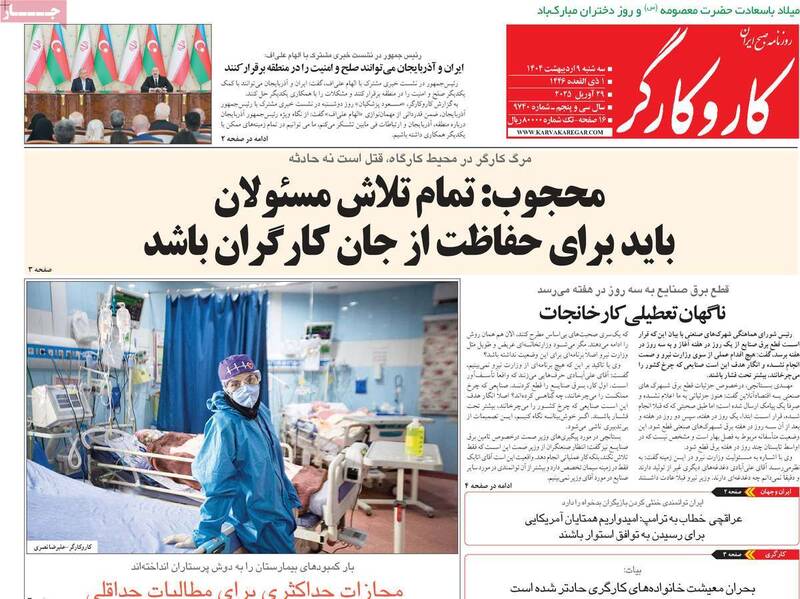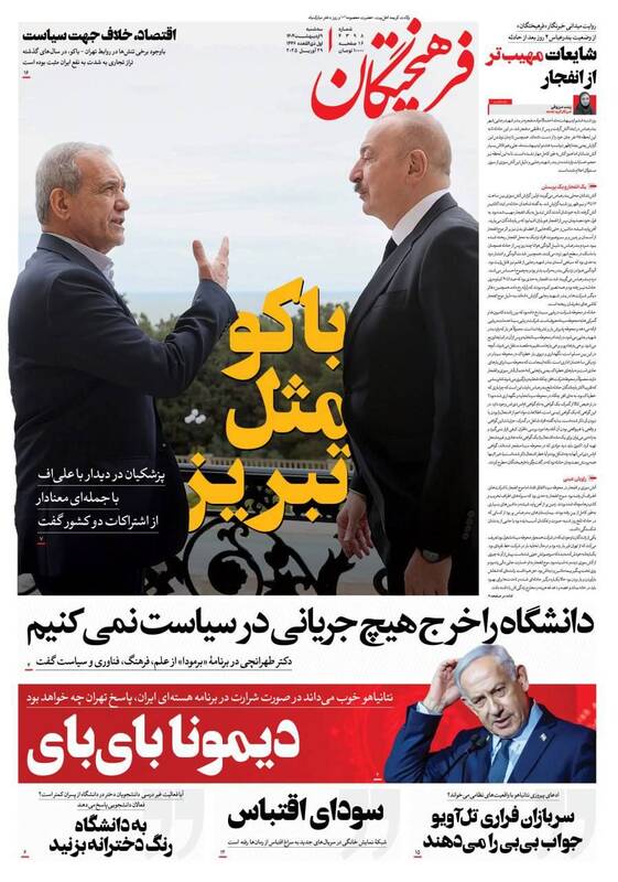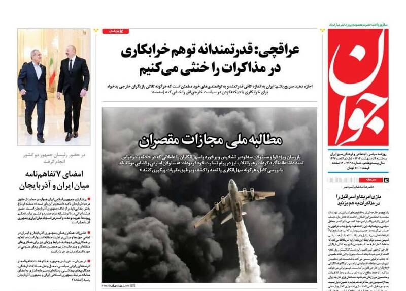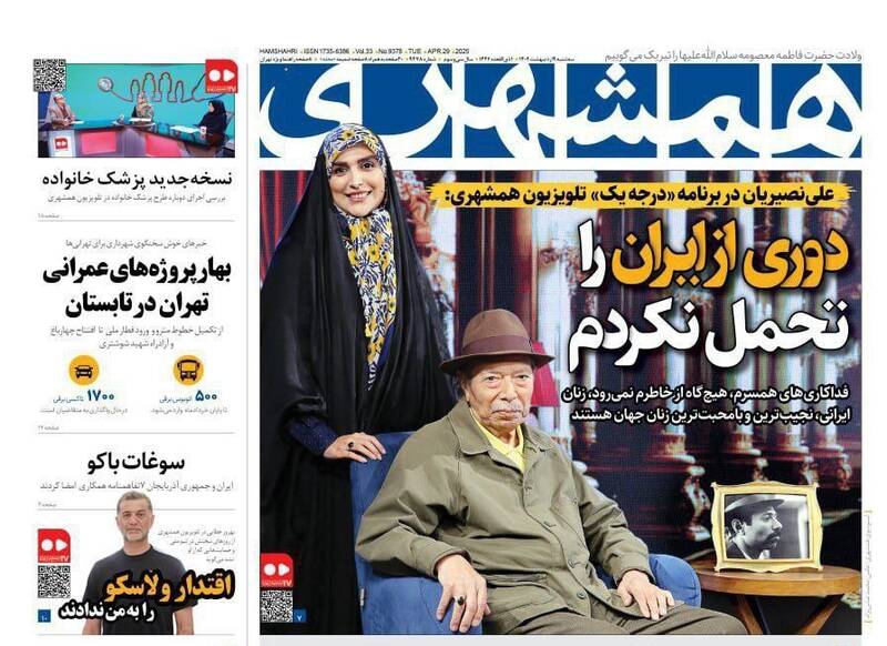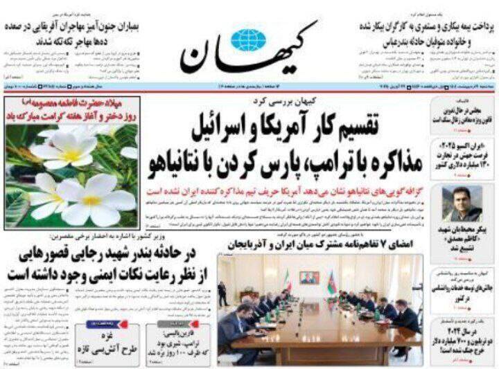 تقسیم کار آمریکا و اسرائیل مذاکره با ترامپ پارس کردن با نتانیاهو، باکو مثل تبریز، بی درنگ پاسخ میدهیم، همدلی اجتماعی در یک سوگ جمعی و…از جمله تیترهای روزنامههای سهشنبه ۹ اردیبهشت ۱۴۰۴ هستند.