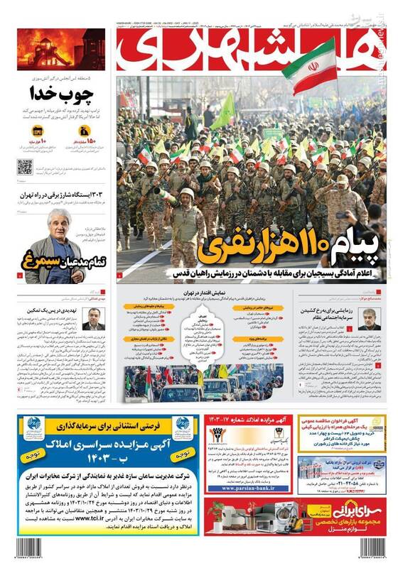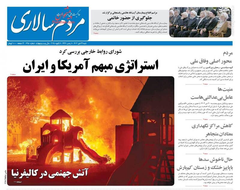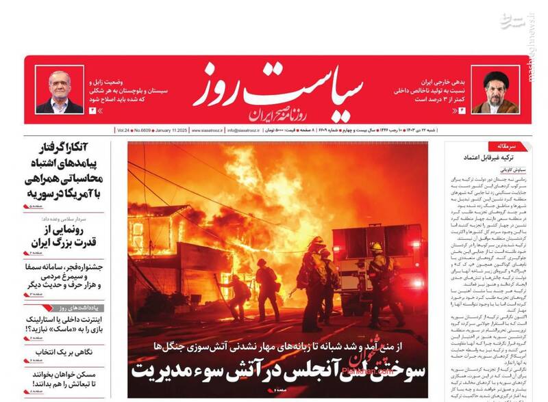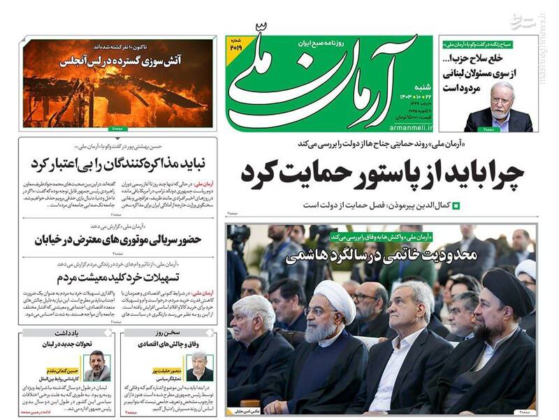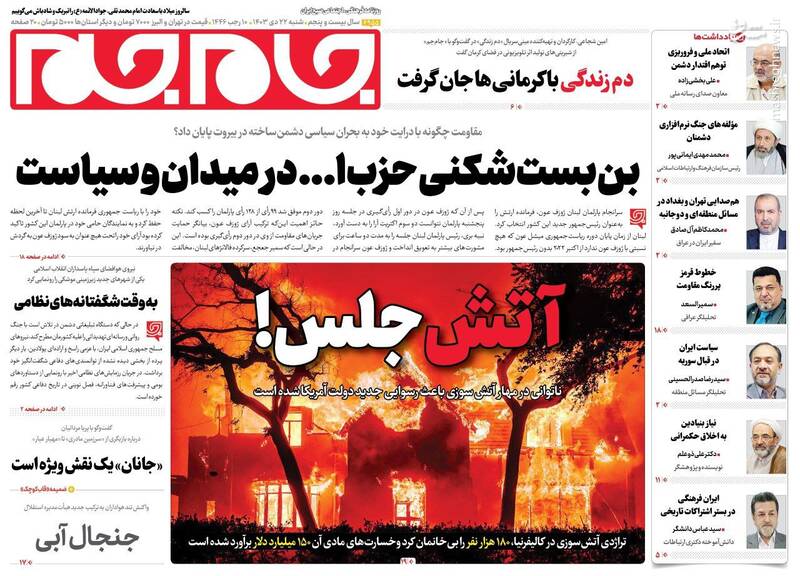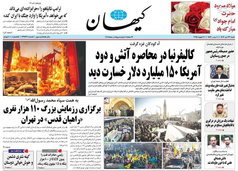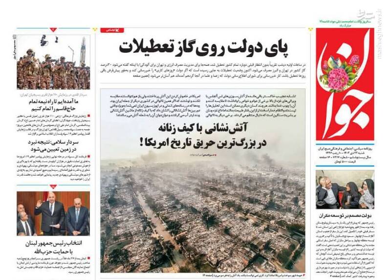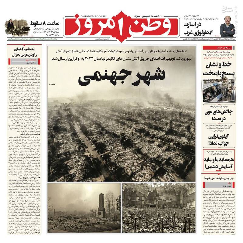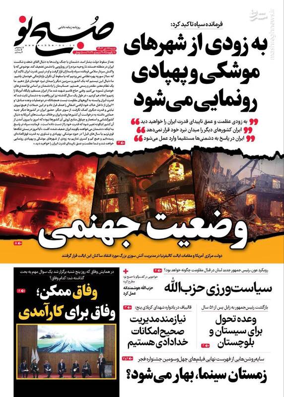 کالیفرنیا در محاصره آتش و دود آمریکا؛ ۱۵۰ میلیارد دلار خسارت دید، پای دولت روی گاز تعطیلات، بهترین گزینه در شرایط موجود، تیتر برخی از روزنامههای شنبه ۲۲ دی ماه ۱۴۰۳ است.