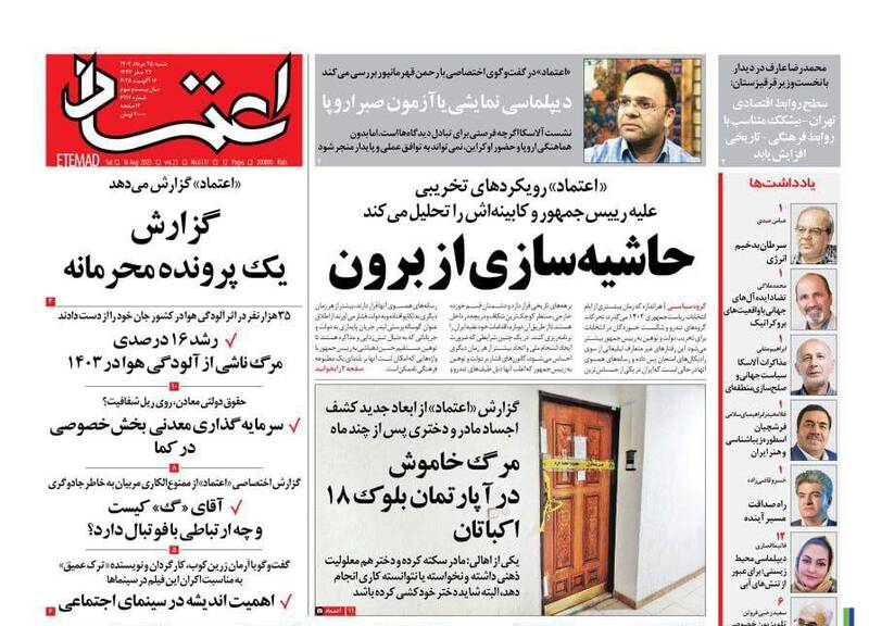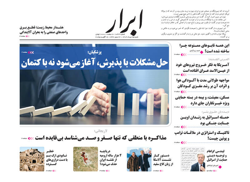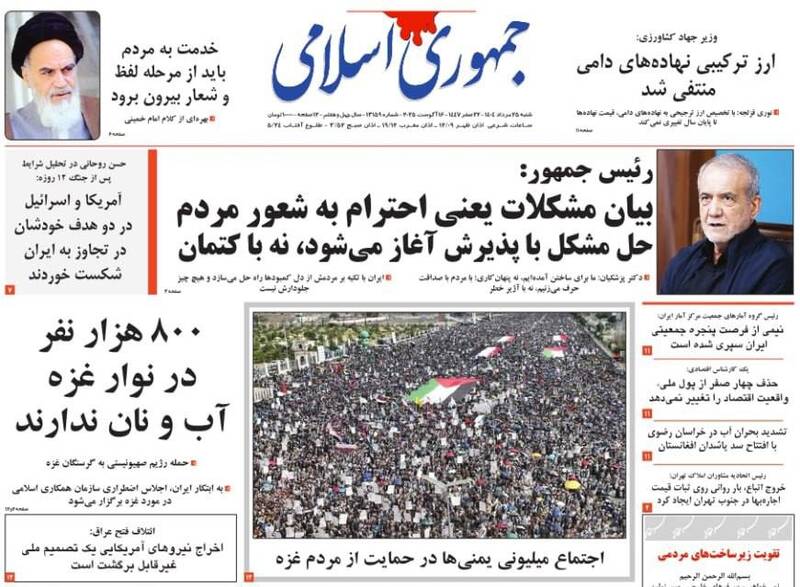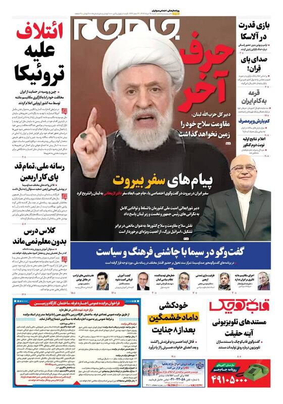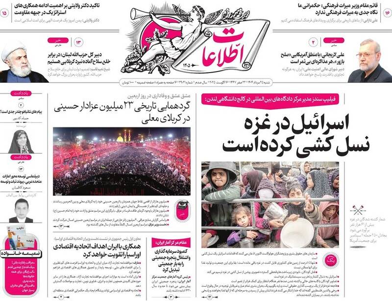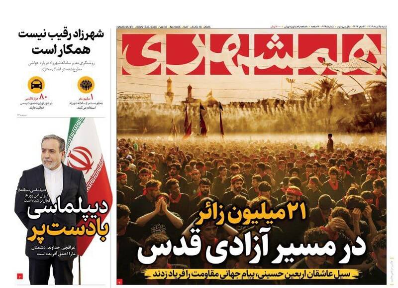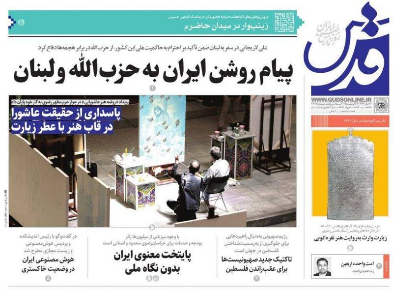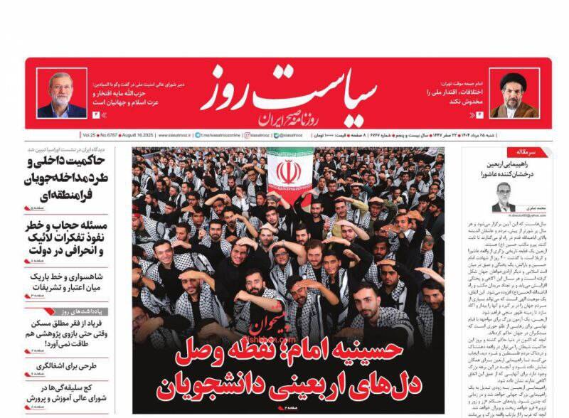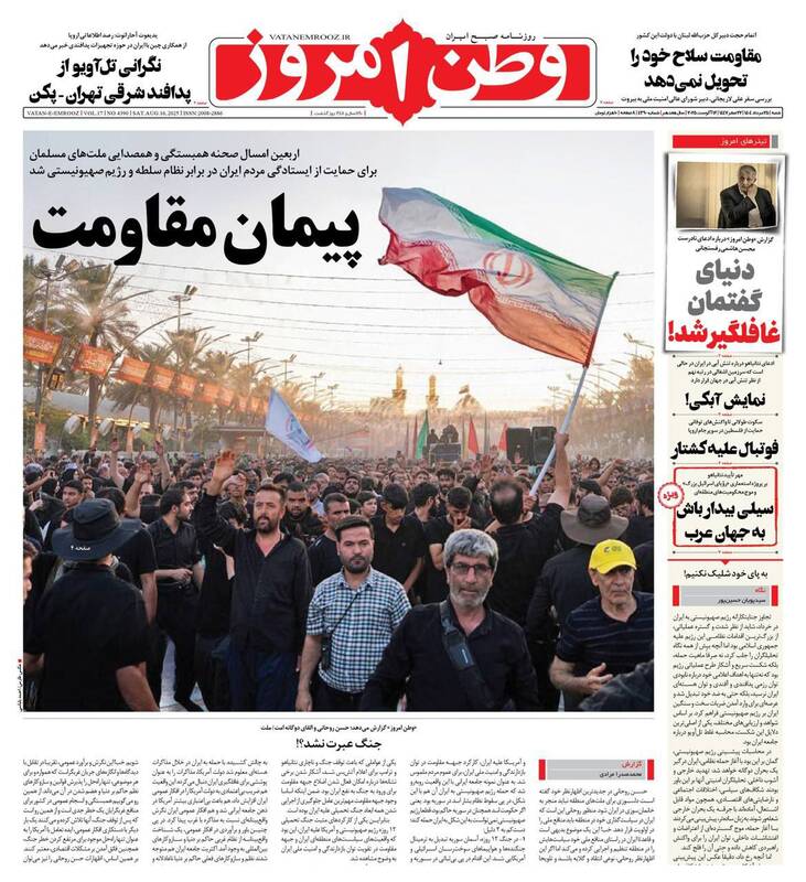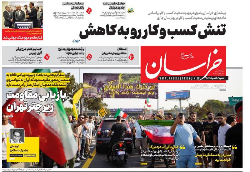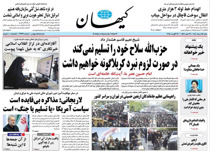 حزبالله سلاح خود را تسلیم نمیکند در صورت لزوم نبرد کربلاگونه خواهیم داشت، بی آب رو، ۲۱ میلیون زائر در مسیر آزادی قدس، نیل عشق و دریای حسین و…از جمله تیترهای روزنامههای شنبه ۲۵ مرداد هستند.