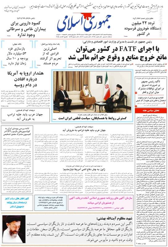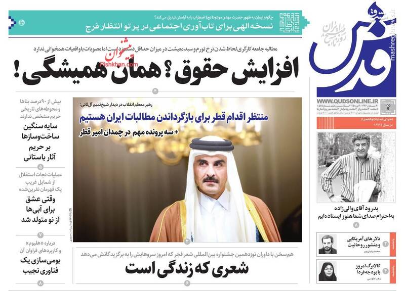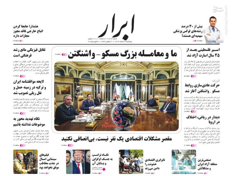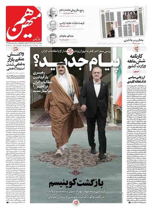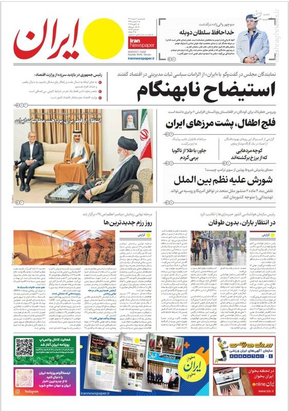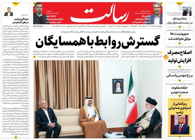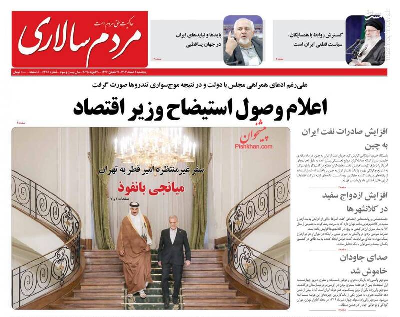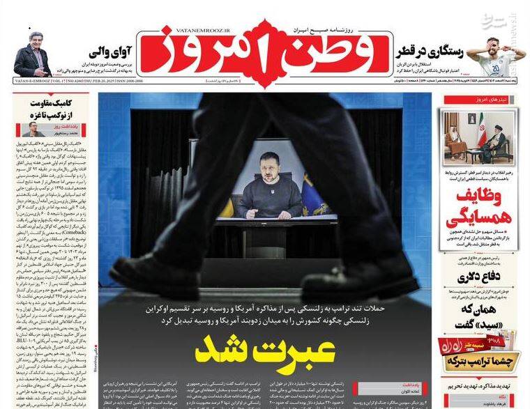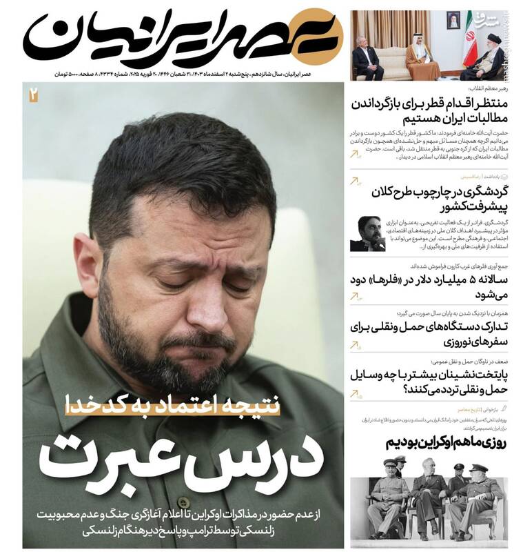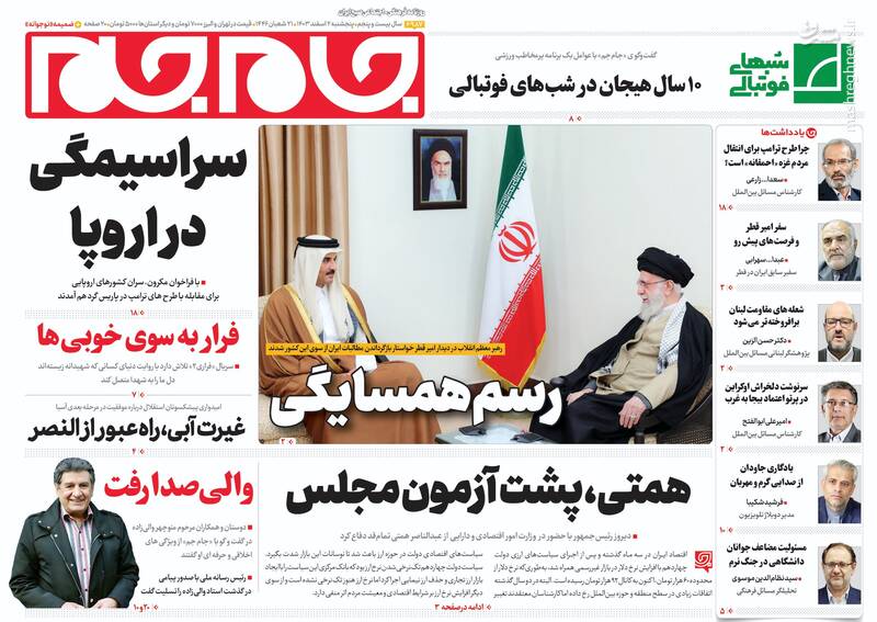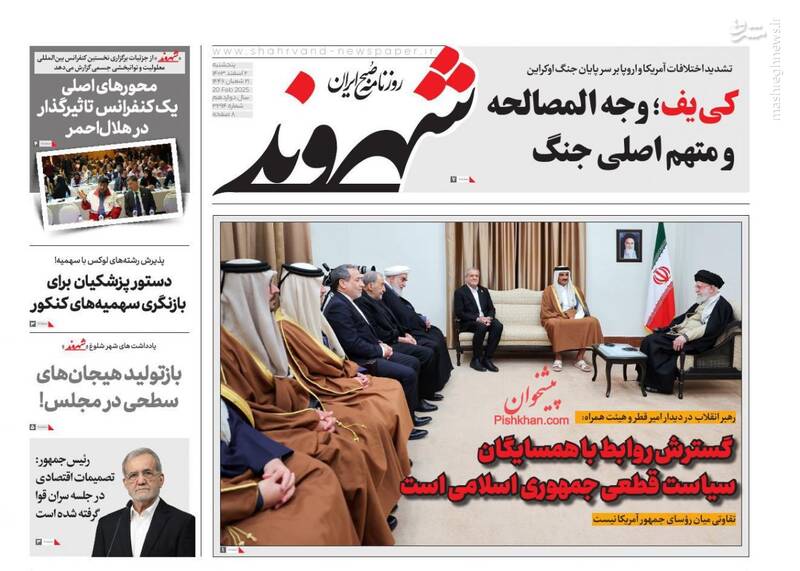 درس استقلال به سران منطقه، اگر جای قطر بودیم به فشارهای آمریکا اعتناء نمیکردیم، سراسیمگی در اروپا، والی صدا رفت، از جمله تیترهای روزنامههای پنجشنبه دوم اسفندماه ۱۴۰۳ هستند.