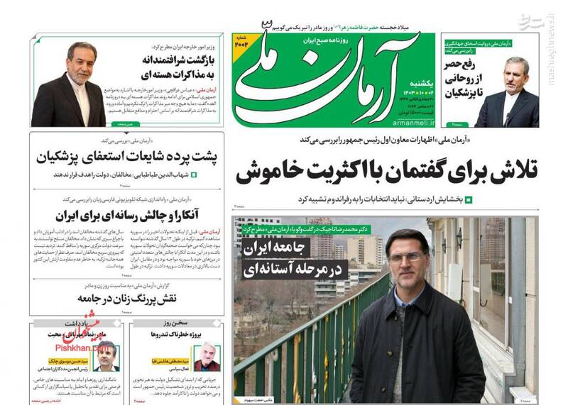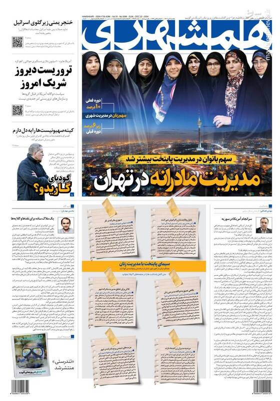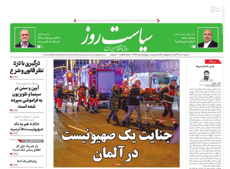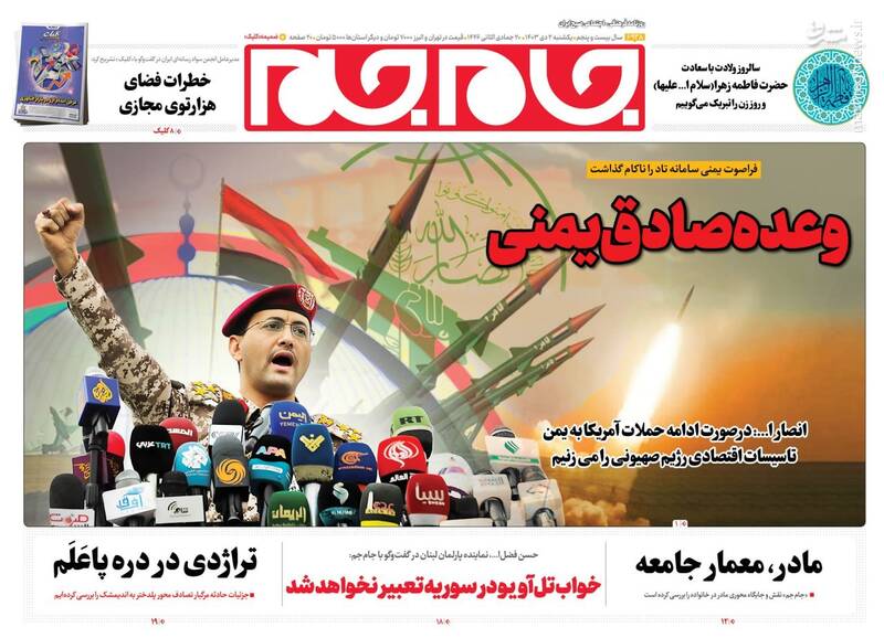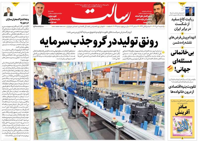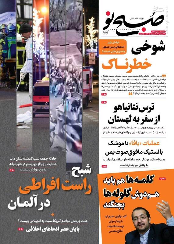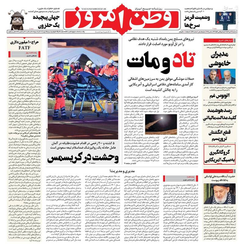 اشغال سوریه از ۳ جهت آمریکا از شرق، اسرائیل از غرب، ترکیه از شمال؛ صدای مافوقصوت یمنی در گوش نتانیاهو؛ وعده صادق یمنی؛ تیتر برخی از روزنامههای یکشنبه دوم دی ماه ۱۴۰۳ است.
